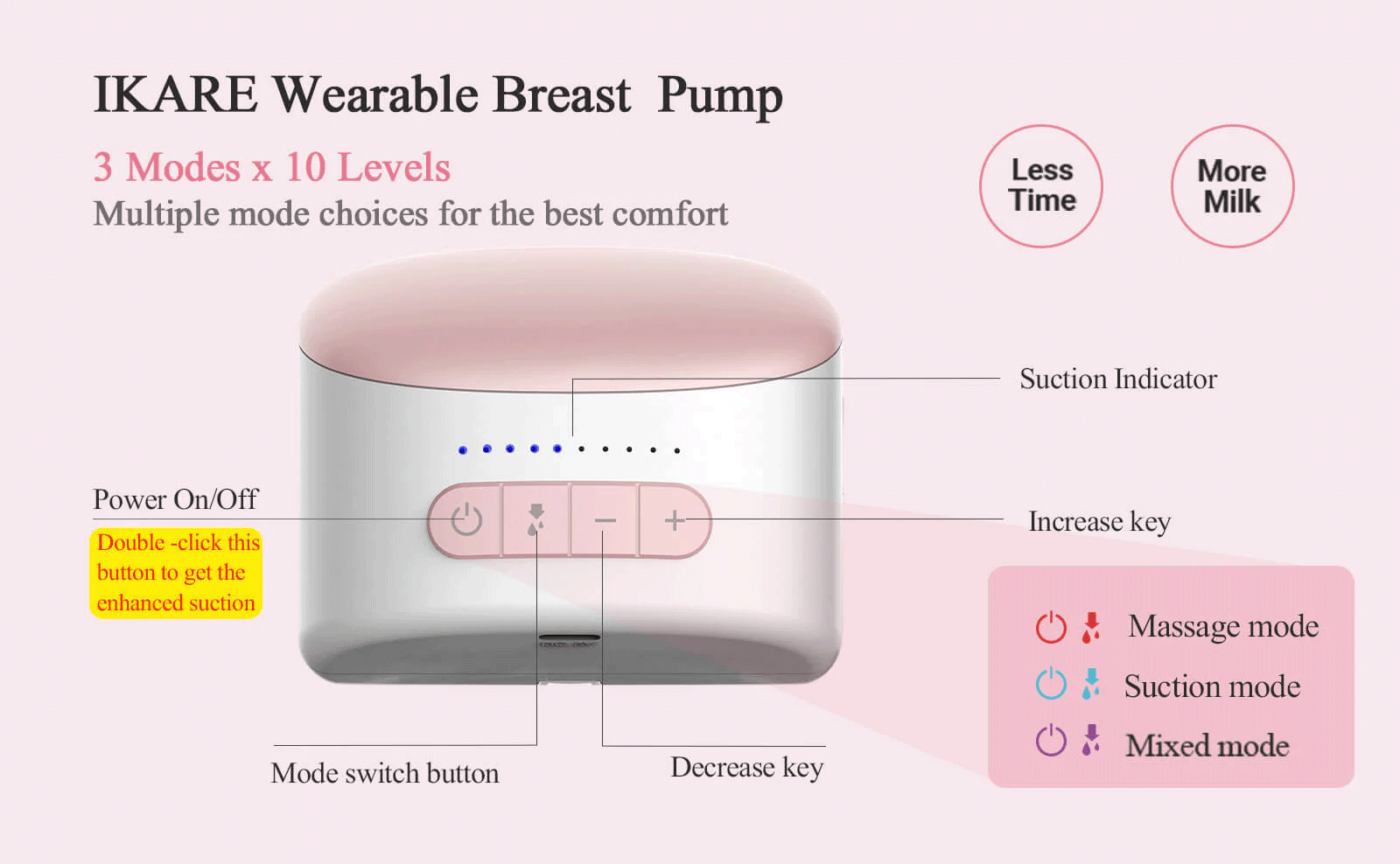 The IKARE® wearable electric breast pump is designed with strong suction power (60-300 mmHg) for quick and efficient milk expression. Simply double-tap the power button to activate enhanced suction, helping you pump more milk in less time.